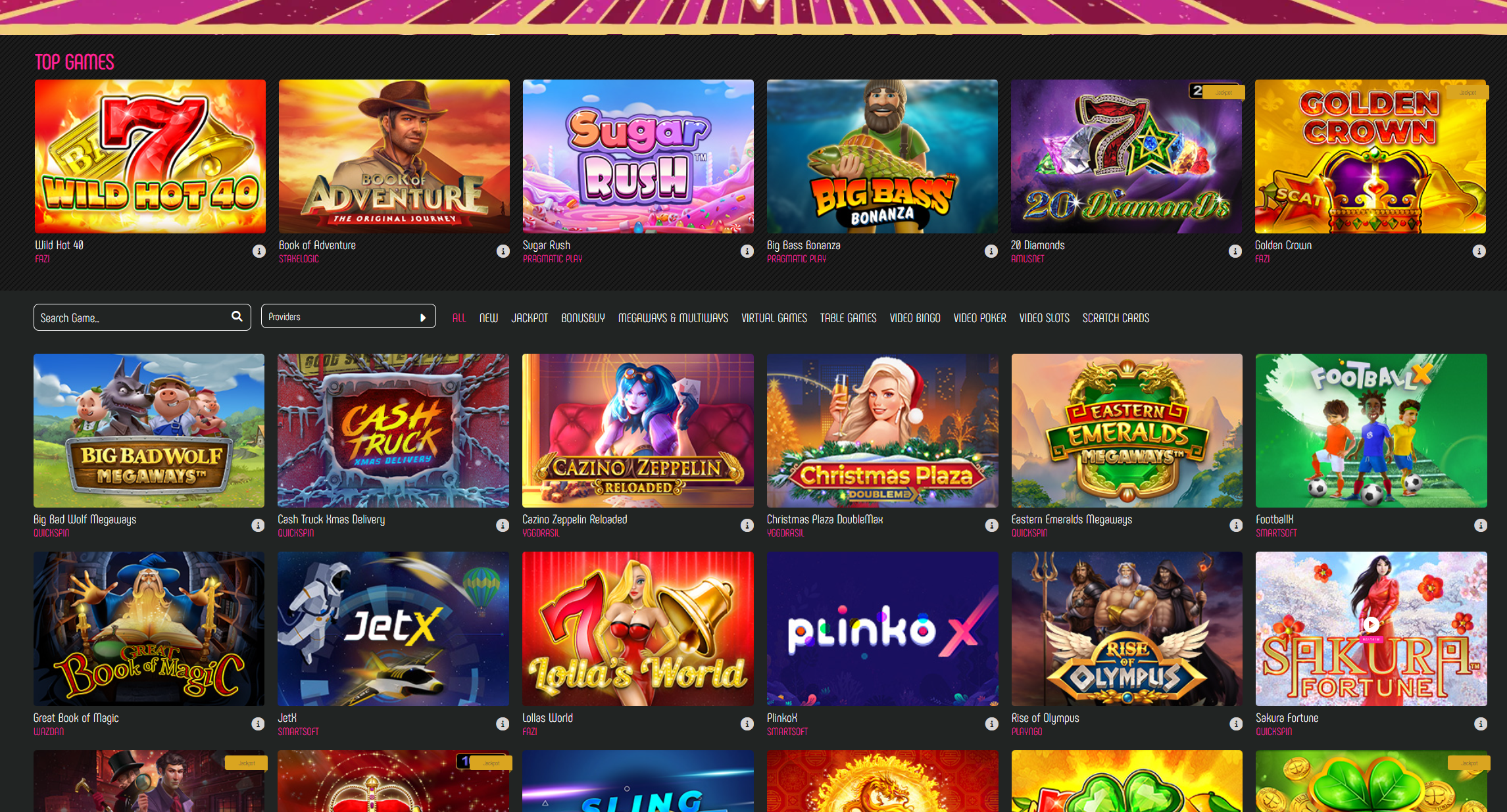 5men Games, Felix Gaming, Amatic, Blueprint Premium, BF Games, Booongo, Betsoft, Blue Guru, Betixon, Xplosive Pro, CT Gaming, Amusnet, EvoPlay, Endorphina, Fugaso gaming, FriendsPlay, Fazi, Booming Games, Golden Race, GameArt Seamless, Gamzix, Caleta, Habanero, Hacksaw, Iron Dog, Kalamba, Kiron, Leap, MicroGaming – 2by2, Merkur Premium, Mascot Games, MicroGaming – Rabcat, Big Time Gaming Branded, MicroGaming – Foxium, MicroGaming – JFTW, Merkur, Microgaming premium, MrSlotty, Elysium, Netent CW, Nolimit, One Touch, Candlebets, Oryx(Gamomat), golden hero group, OneGame, Oryx, PeterNSons, Givme, Arcadem, Pragmatic Play, PlayPearls, PG Soft, Salsa, Push Gaming, Playson Premium, Playson, ReelPlay, Felt Gaming, Relax Gaming, Quickspin, Red Tiger Branded, RedRake, Revolver, Swintt Premium, Spadegaming, Spinmatic, Spinomenal, SmartSoft, StakeLogic, TomHorn, Thunderkick, Triple Pg, Virtual Generation, WooHoo, Wazdan, 1X2 Gaming, YggDrasil, AsiaGaming, BetGames, eBet, Evolution Livecasino, EZ livecasino, Hollywood Tv, LiveG24, OnAir, Bombay Live, Pragmatic Play Live, Real Dealer Studios, VivoAladdin, VIVO livecasino.